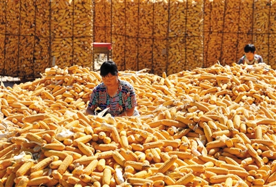 10月9日,河北省晋州市周家庄乡的农民将收获的玉米剥皮。