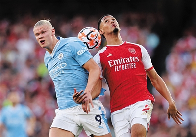 10月8日,阿森纳队球员萨利巴(右)与曼城队球员哈兰德在比赛中拼抢。
