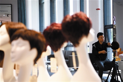 10月11日,工作人员在河南瑞贝卡发制品股份有限公司的展厅内修剪假发。