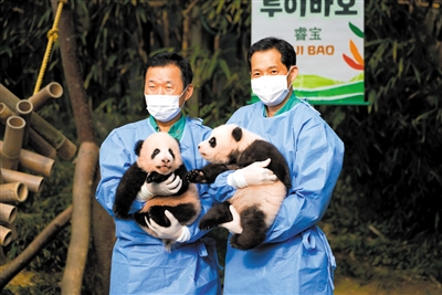 当日,旅韩大熊猫“爱宝”、“乐宝”的双胞胎幼崽首次与公众见面。双胞胎幼崽的名字“睿宝”、“辉宝”也同时公布。