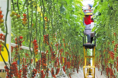 近日,在甘肃省平凉市崆峒区四十里铺镇的智能玻璃温室里,采用基质吊架立体栽培系统等技术培育的串收番茄陆续成熟,务工人员忙着收获、打包,准备进行销售。近年来,平凉市着力发展设施蔬菜产业链,不仅为市场提供了高品质产品,还帮助群众实现就近就业。