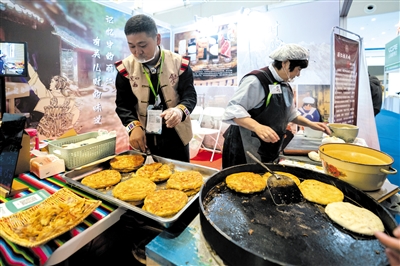10月13日,两名参展商在云南国际餐饮美食暨预制菜产业博览会上制作丽江粑粑。