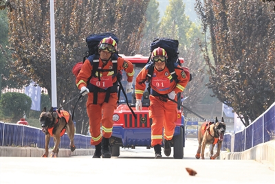 10月13日至15日,第七届全国消防搜救犬技术比武竞赛在山东济南举行,来自全国31个消防救援总队及森林消防队伍、南京训练总队共计330名训导员及256头搜救犬参加本次比赛。