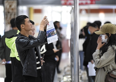 ▲10月14日,求职者在招聘会现场了解岗位信息。