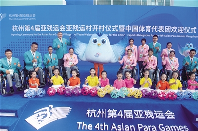10月16日,中国体育代表团成员、参加文艺演出的小演员与杭州亚残运会吉祥物“飞飞”合影。当日,杭州第4届亚残运村举行开村仪式暨中国体育代表团欢迎仪式。