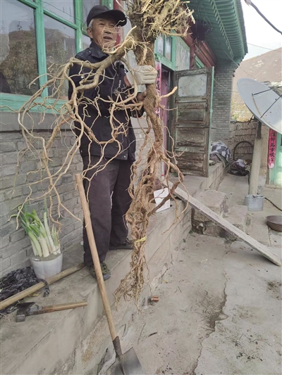 18日,浑源县青磁窑镇西泥沟村陈志夫妇外出挖黄芪时,意外发现一株大黄芪。该株黄芪近2米高,净重15斤,至少生长了60多年。面对如此硕大的黄芪,众人啧啧称奇。村里一位90多岁的老人称,他是第一次见到这样大的黄芪,简直可以称为“黄芪王”。