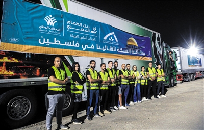 10月19日,在拉法口岸埃及一侧,志愿者们站在装载有人道援助物资的货车前。