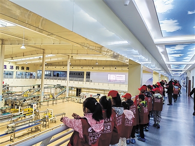 同样的惊奇来自生产车间,通过高大干净的玻璃幕墙,同学们看到了灌装、消毒、包装等系列生产过程。车间内工作人员很少,取而代之的是高科技的全自动生产线,向他们展现科技与生产完美结合的同时,也在大家心中种下了爱科学的种子,让小记者们真切感受到了“科技改变生活”。