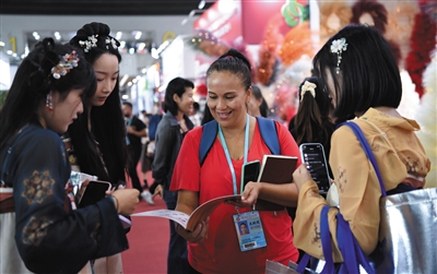 10月23日,外国采购商(中)与参展商工作人员洽谈。