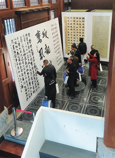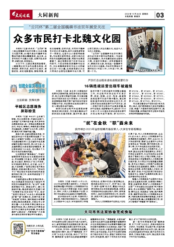 本报讯 (记者 崔莉英) “云冈杯”第二届全国魏碑书法双年展21日在北魏文化园开展,200幅代表当代魏碑书法整体风貌的精品震撼亮相,连日来,众多市民打卡北魏文化园,在展厅驻足欣赏,切磋交流,拍照留念。