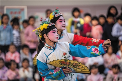 当日,云南省昆明市五华区文林小学开展滇剧演出活动,少儿滇剧传习班的小演员们表演了多个节目。文林小学自2014年开始与昆明市文化馆联合开展滇剧进校园活动,成为云南省滇剧文化传承项目的第一所试点小学。目前,学校已累计培养小演员近500名,孩子们加深了对非遗文化的认识,提升了审美情趣和艺术素养。