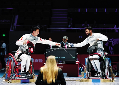 10月26日,在杭州第4届亚残运会轮椅击剑项目男子花剑团体决赛中,中国队以45比26战胜伊拉克队,夺得冠军。图为中国队选手孙刚(左)和伊拉克队选手扎伊努拉布丁·马德胡里在比赛后相互致意。