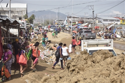 ◀ 10月28日,在墨西哥格雷罗州阿卡普尔科,人们走在被洪水损坏的道路上。