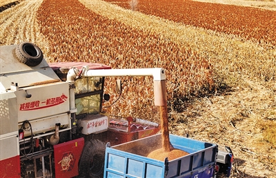 10月26日,在天镇县卅里铺乡高墙框村,3000余亩高粱连绵成片,映红山野,正是收获的季节,田地中收割机抢收正忙。