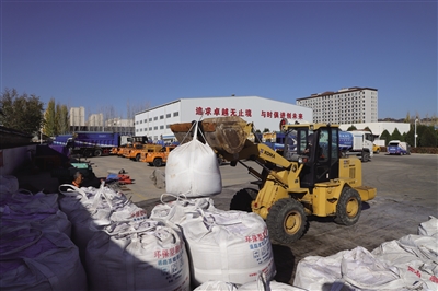 图为市新城环境公司加紧储备融雪剂。 本报记者 杨昱郁 摄