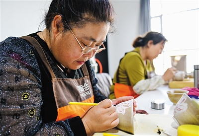 图为万家乐移民新区的居民宋海芳在陶瓷制品上刻花。
