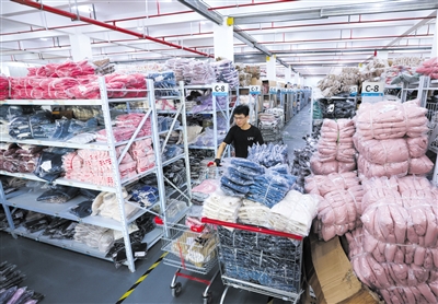 11月8日,在位于织里镇的湖州织里煜果果制衣厂库房内,工作人员根据订单拣货。