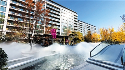 园林景观打造了6.8万平方米的东方官派山水园林景观,规划一河两轴、五园九景。中轴以水为脉南北贯通,犹如一只瑞狮象征着品位与智慧;东西两条超级景观绿轴,筑起家门口的静音空间和生态屏障:“四水归堂”下沉会所,地上回形连廊,营造如同颐和安曼酒店般的归家仪式;中央水景——翡翠之心,三季有水,冬季作为下沉广场。