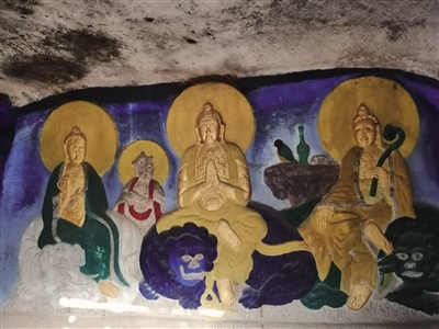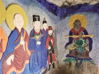 史料记载,明弘治五年(1492),游击将军董公“凿深洞于后,建邃阁于前”,在窟内捐资造像。短小的文字,交待出盘山石窟开凿年代及开凿之人。不过难以解答今人诸多疑问。一问,佛像造窟之风至唐末已然削弱,为何在明中期的长城边镇又现;二问,石窟中雕像有儒士装扮,这般穿戴原型是谁?作为游击将军,雕凿者是否将自己的崇敬之人也一并刻石纪念呢?或是身在沙场内心却向往经史子籍中的日子,把希望雕刻在石壁间;三问,雕塑中似有关帝造型,身上着装却似蒙古贵族,不知作何讲究。此外,为何只有一个洞窟有雕像,另一洞窟所为何用,仿寺庙内塑像参拜还是供修行之人起居?凡此种种,恐怕只能从岁月留存的点滴中猜想了。