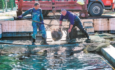 图为近日,对接北京地区市场的下北泉村虹鳟鱼养殖基地迎来收获季,价格、产量全线飘红,工人正在打捞虹鳟鱼、鲟鱼,装车发货。
