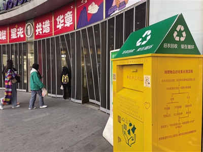 11月12日,记者在永泰南路一家大型商场门前看到,造型别致的分类垃圾箱摆放在门口左边显眼位置,箱体上印有“让垃圾分开旅行,让城市更加美丽”的广告语,让消费者顿感文明就在眼前;门口右面摆放着一个戴着“绿帽子”的旧衣回收箱,不时有路人凑近拍照打卡。