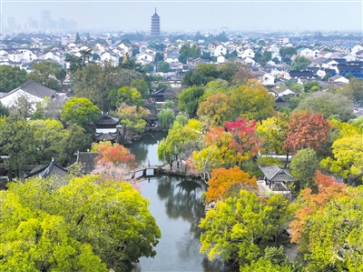 初冬时节,江苏苏州拙政园内色彩斑斓,景色如画,吸引众多游客前来参观游览。