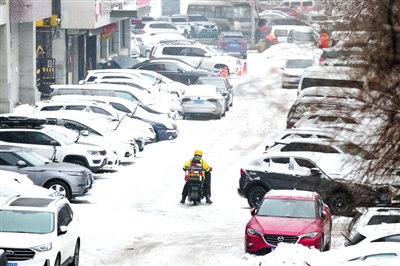 ◀ 11月16日,送餐员冒雪送餐。
