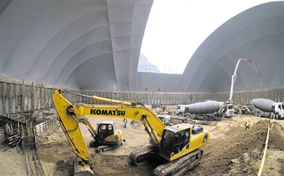 11月17日,工人在“基坑气膜”内工作。近日,北京西城区广外街道三统碑综合大厦项目施工工地上空出现了一个巨型银色“大气球”,总覆盖面积可达4240平方米。这个巨型“大气球”是施工工地安装的大跨度、智能化、创新性的“基坑气膜”,通过气膜内外压力差形成球形建筑,隔绝施工噪音、降低粉尘外溢,同时提高冬季施工环境温度。