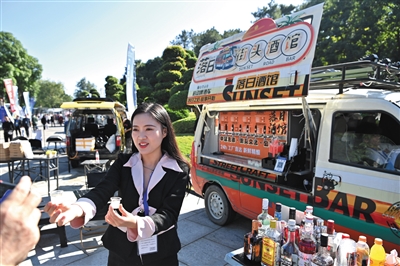 11月18日,一名汽车尾箱摊主在推销饮品。