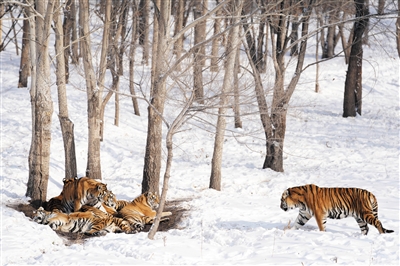 冰城哈尔滨市近日迎来数次降雪天气,在黑龙江东北虎林园,散放区的东北虎在雪地活动。