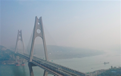 11月19日,试验列车驶过宜宾市境内的宜宾临港长江公铁大桥(无人机照片)。