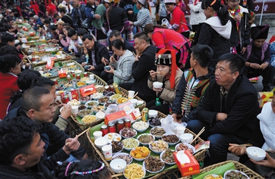 11月19日,绿春县哈尼族群众与游客一起品尝哈尼长街古宴。