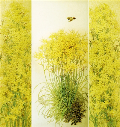 赵美玲说,中国的传统工笔画中,各种花卉和花鸟固然很美,但作为一名大同画家,她更愿意用手中的画笔展现大同的风物之美。凝视大同黄花,很具有一种不争之美,淡雅而清新,内敛而沉静。赵美玲在用心观察与悉心描画中尽力展现出黄花的诗意之美,在她笔下的黄花,色彩清新淡雅,线条细如春蚕,带给人一种非常美好的视觉享受,格外触动观赏者心灵。创作中,她用心把她的情感、思考与个性化的艺术语言注入到笔下的景致中,带给人清新、自然、闲雅的审美体验。