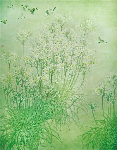 赵美玲的许多作品都是大尺幅的工笔创作,颇费工夫,也需要超凡的静心静气。在赵美玲身上,很能感受到这样的静气,素心如水,恬然安闲,专注虔敬。在她看来,静能冶性,也能修养,还能洞悉而通灵。赵美玲的工笔画拥有这样的特质,在她的作品中,把自我真切的心底感受,倾情浸染在画作的墨彩和线条里,作品洋溢着清新、淡雅、灵动,画风朴实、恬静、唯美。