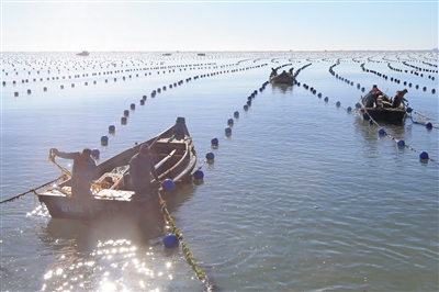 近期,在“海带之都”山东省荣成市,海带养殖区展开海带“播种”作业,渔船在海面来往穿梭,一派忙碌景象。