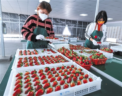 11月21日,草莓共富合作工坊的工作人员打包刚刚采摘的草莓。