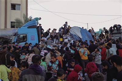 ◀ 11月21日,在加沙地带南部城市汗尤尼斯,民众领取饮用水。