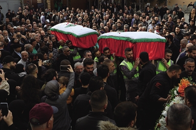 11月22日,在黎巴嫩贝鲁特,人们为两名在以军袭击中丧生的记者举行葬礼。