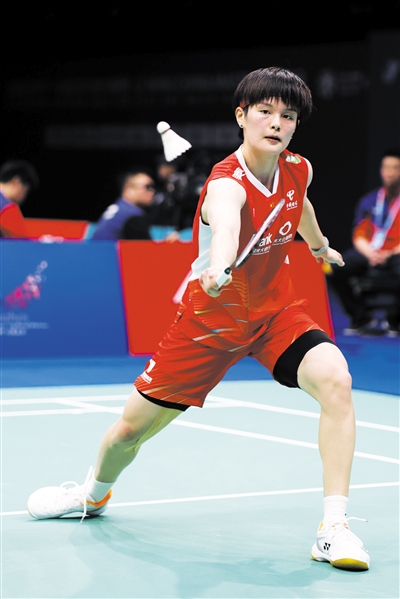 11月23日,在广东深圳举行的2023中国羽毛球大师赛混合双打次轮比赛中,中国选手王祉怡以2∶0战胜韩国选手安洗莹,晋级八强。图为王祉怡在比赛中回球。