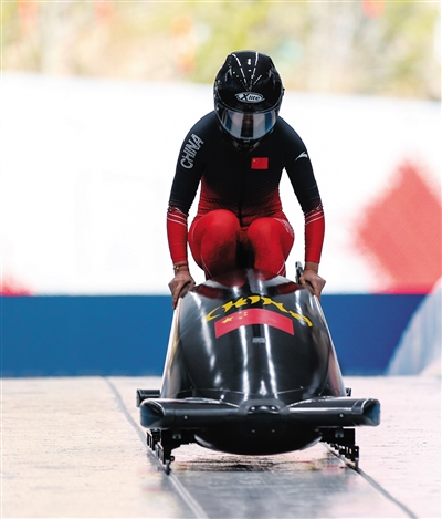11月23日,第十四届全国冬季运动会雪车项目比赛在国家雪车雪橇中心开赛。图为吉林队选手怀明明在女子单人雪车比赛中。
