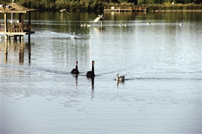 从公园正门进入,沿着步道环行不久,一处湖泊在从林芦苇中闪现,波光粼粼间,天鹅凫水,野鸭嬉戏,还有不知道名字的水鸟上下翻飞,游人三两拍照留念,轻语笑谈,一切都显得那么美好。湖边立有物种介绍牌,为访客介绍有关湿地中花鸟鱼植的知识,据说,这里的常见动物有鱼类、两栖类、鸟类和兽类,隶属3纲24目42科75属100多种,植物有45科124属195种,禾本科有21属,菊科有12属,豆科和黎科分别有11属和9属。可谓自然界生态博物馆。