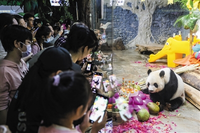 当日,为庆祝大熊猫“贡贡”和“舜舜”来到海南五周年,位于海口的海南热带野生动植物园为这对“熊猫兄弟”准备了玩具和竹笋、水果等美食,同时举办多种科普活动和互动游戏,吸引不少游客参加。