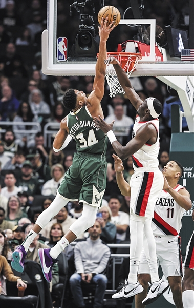 11月26日,雄鹿队球员安特托昆博(左)在比赛中扣篮。