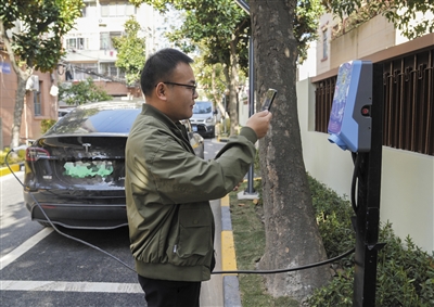 11月29日,在上海市徐汇区田林十三村小区内,居民通过手机扫码,使用充电桩为新能源车充电。