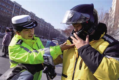 12月2日,在乌鲁木齐南湖路附近,乌鲁木齐市公安局交警支队民警检查一名外卖骑手头盔佩戴情况,并向其宣讲交通安全知识。