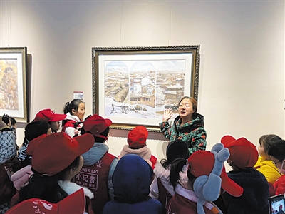 “几位艺术家用手中的画笔,通过不同的视角,把长城的沧桑之美、生态人文以及对长城的热爱展现得淋漓尽致。”参观中,大同市长城文化旅游协会会长袁建琴向小记者们详细讲解大同长城的历史及保护现状等。“通过《北李璘的冬天》《故园初雪》《老营堡的冬天》这几幅作品,我们可以看到长城脚下的村落美景。”聆听着袁老师的讲解,小记者们一边感受着大同长城的沧桑巨变、雄阔壮丽和粗犷昂扬之美,一边用笔记录下自己的所见所闻。