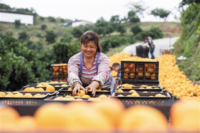 近日,贵州省罗甸县的脐橙迎来收获季,农民在脐橙种植基地采摘、搬运脐橙,供应市场。