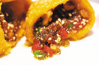 我市厨界大师赵富平介绍说,老大同的红白宴席、盖房上梁、乔迁新居、金榜题名、大人小孩过生日等重要活动都要吃油炸糕。家里来了客人,以油炸糕款待被视为最高礼仪之一。油炸糕的馅料不仅种类多,而且制作颇为复杂。馅料主要有豆馅、菜馅、韭菜馅、糖馅、髓油馅,还有目前已失传的水晶馅、澄沙馅及肉末馅。豆馅,也称豆沙馅,将红小豆或豇豆或扁豆浸泡、焖至软烂,加入糖捣成泥即可。老大同菜馅油糕的菜馅与当今的菜馅略有不同,配料多且讲究:除了地皮菜、韭菜外,还将腌过的红萝卜、大腌菜剁碎泡入水中,除去咸味后攥干备用。此外,还要加剁碎的松根毛瓤(苤蓝叶子)。松根毛瓤是在腌大腌菜时,把松根上的茎叶揪下晒干,做馅时用水泡发,颜色翠绿。将这些配料加调味料即可。“老大同人在烹饪中极具智慧,松根毛瓤在菜馅中很好地起到了配色作用。”赵富平说,老大同人还吃肉末馅油糕,现已失传。做法为先将牛肉或猪肉或羊肉炒熟,第二天包糕时,将炒好的肉切成末,加入菜馅中即可。肉末馅油糕风味独特,咸香味美。韭菜馅,在老大同专指韭菜鸡蛋馅。水晶馅,是将猪板油撕去筋膜、切成小块,加入苜蓿(桂花)、玫瑰、白糖,并按比例加入白面拌匀,然后再加入麻仁(芝麻仁)、瓜仁(瓜子仁)、桃仁、青丝、红丝拌匀。猪板油不汆不烫,就是生拌,且边拌边擦。水晶馅中的猪板油遇热便会融化,馅料中看不到猪油,却可使馅料滋润,吃起来香甜可口,十分美味。澄沙馅,是在豆沙馅中加苜蓿(桂花)、玫瑰,再按比例加入水晶馅即可。