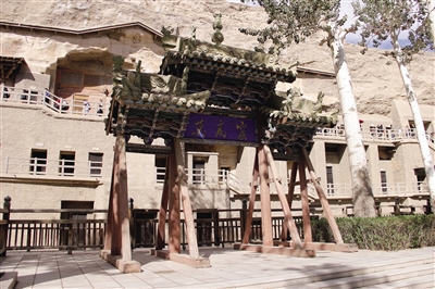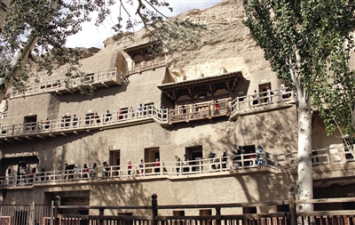 由敦煌市区往东近10千米,过一个三岔路口转南,进入茫茫戈壁,再行不久,眼前两山夹谷,水流潺潺,闻名世界的莫高窟到了。