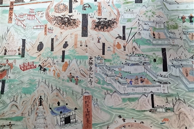 在第61窟,还有一处壁画珍宝——《五台山》图。不少人是从梁思成、林徽因发现佛光寺的故事中得知这幅图的。它高3米,长度超过13米,描绘五台山的地理形势和主要寺院,图上清晰地展示出东西南北中五台的位置,山中分布寺院、兰若,与唐代文献记载相符。据说1937年6月,梁思成林徽因夫妇和中国营造学社的另外两位学者,正是凭借《五台山图》发现的线索来到五台山,找到了隐于深山幽谷之中的佛光寺。